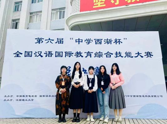 2023年11月11日—12日,由中國教育電視臺、絲路語言文化研究中心主辦,教育部國家語言文字推廣基地(泉州師范學(xué)院)、廈門中學(xué)西漸信息科技有限公司協(xié)辦,江西理工大學(xué)承辦的第六屆“中學(xué)西漸”杯全國漢語國際教育綜合技能大賽圓滿結(jié)束。西安科技大學(xué)高新學(xué)院代表隊晉級2023年“中學(xué)西漸”杯全國漢語國際教育綜合技能大賽總決賽,與江西贛州與漢語國際教育界的同行們同臺競技,交流經(jīng)驗。在來自全國各地的170所院校的參賽隊伍中,西安科技大學(xué)高新學(xué)院漢教20級喬婷、21級蘇梓彤、王若楠在教研室李葉老師、李宣頤老師和文安東老師三位指導(dǎo)老師的悉心指導(dǎo)下,同時在張慧慧、賈雅茜和馬雅婷三位同學(xué)的協(xié)助下,獲得2023年第六屆“中學(xué)西漸”杯全國漢語國際教育綜合技能大賽中本科組二等獎,李葉老師、李宣頤老師和文安東老師三位老師獲得“優(yōu)秀指導(dǎo)教師”榮譽稱號。
