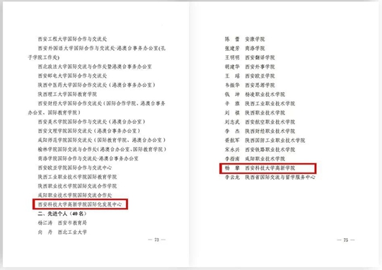 中共陜西省委教育工作委員會(huì)陜西省教育廳下發(fā)《關(guān)于2022年度全省教育系統(tǒng)綜合表彰的通報(bào)》(陜教工函〔2023〕46號(hào)),西安科技大學(xué)高新學(xué)院在外事(港澳臺(tái))工作中共榮獲兩個(gè)獎(jiǎng)項(xiàng):西安科技大學(xué)高新學(xué)院國(guó)際化發(fā)展中心榮獲2022年度陜西教育系統(tǒng)外事(港澳臺(tái))工作先進(jìn)集體;國(guó)際教育與人文學(xué)院行政秘書暢攀老師榮獲2022年度陜西教育系統(tǒng)外事(港澳臺(tái))工作先進(jìn)個(gè)人。