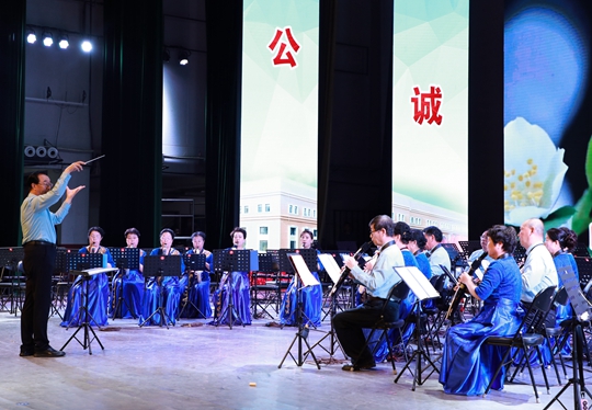 中樂協(xié)音教委/薩克斯(電吹管)專業(yè)委員會副主任劉志軍致辭。他說,在這初夏時節(jié),來自全國各地的電吹管藝術(shù)家們齊聚美麗的西北大學(xué)現(xiàn)代學(xué)院,漫步在這所大學(xué)校園,校園內(nèi)四處綻放的月季和栽植的其他名貴花草樹木等所營造出的高雅大氣的校園環(huán)境,使每一位來此的友人都能感受到這所大學(xué)深厚的文化底蘊(yùn)和獨(dú)特的魅力,希望此次音樂會能夠給與會者帶來藝術(shù)和美的享受,讓至真、至美、至善的情感在高雅的樂聲中盡情釋放,期待與會者能夠在這充滿藝術(shù)人文氣息的校園里度過一段歡快美好的時光。