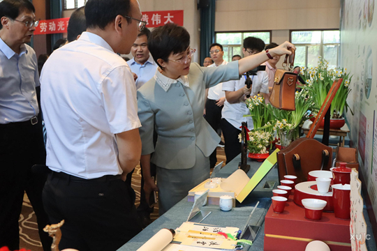 漳州市副市長余向紅(右)在展臺前欣賞嘉庚學子作品