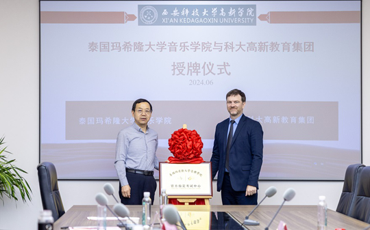 西安科技大學(xué)高新學(xué)院董事長孫龍杰與泰國瑪希隆大學(xué)音樂學(xué)院招生辦主任SCHAUB CHRISTOPHER GLENN共同為泰國瑪希隆大學(xué)音樂學(xué)院官方指定考試中心進(jìn)行授牌儀式!肮俜街付ǹ荚囍行摹,是瑪希隆大學(xué)官方授權(quán)的考試中心,為音樂類相關(guān)專業(yè)學(xué)生的本碩博海外升學(xué)提供了更加便捷的升學(xué)通道,通過內(nèi)部的考試培訓(xùn)可以順利直通瑪希隆大學(xué)。
