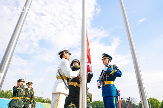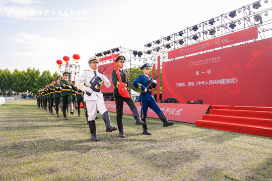 畢業(yè)典禮在升國旗、奏國歌中拉開帷幕。國旗護(hù)衛(wèi)隊(duì)手持五星紅旗,雄壯激昂的國歌響起,五星紅旗冉冉升起,全體師生向國旗行注目禮。