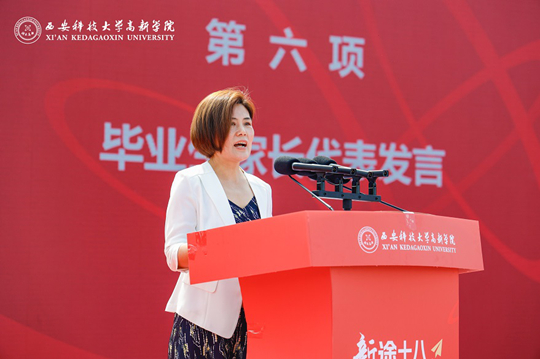 2024屆畢業(yè)生董佳源同學(xué)的媽媽作為學(xué)生代表發(fā)言,她向畢業(yè)生致賀并向老師致謝,她回憶了董佳源同學(xué)四年的成長(zhǎng),對(duì)學(xué)校的培養(yǎng)表示感謝,她鼓勵(lì)同學(xué)們傳承“自強(qiáng)不息日新月異”校訓(xùn)精神,秉持終身學(xué)習(xí)的目標(biāo),努力成為有溫度的新青年。