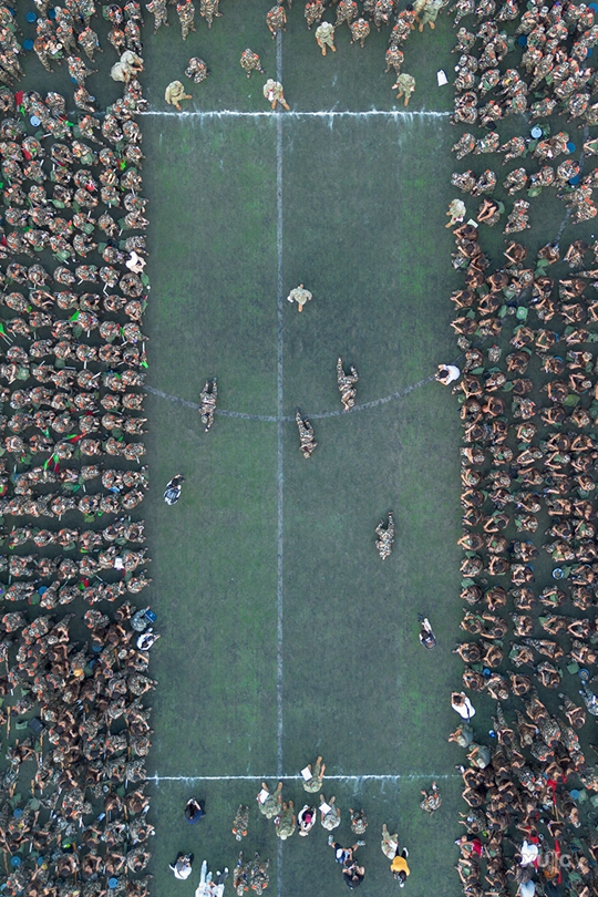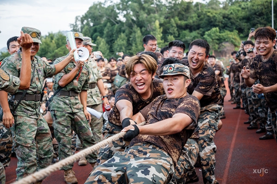 比賽逐漸進(jìn)入白熱化階段,拔河比賽正式開始。參賽人員以營為單位分成4個(gè)隊(duì),每個(gè)營出20人(男12名、女8名),采取三局兩勝制!耙、二!一、二!”在一聲聲的口令中,參賽選手們緊握粗繩,團(tuán)結(jié)一心、一鼓作氣,鉚足了勁向后仰,教官與同學(xué)們也紛紛上前加油助威。經(jīng)過激烈角逐,一營奪得本輪比賽的桂冠,F(xiàn)場,教官與學(xué)子們進(jìn)行了一場友誼對決,此起彼伏的歡呼與吶喊聲中,氣氛達(dá)到高潮。