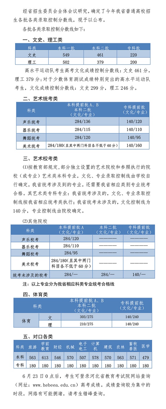 2019年河北省普通高校招生各批各類(lèi)錄取控制分?jǐn)?shù)線