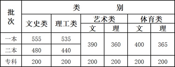 云南省2020年普通高校招生錄取最低控制分?jǐn)?shù)線