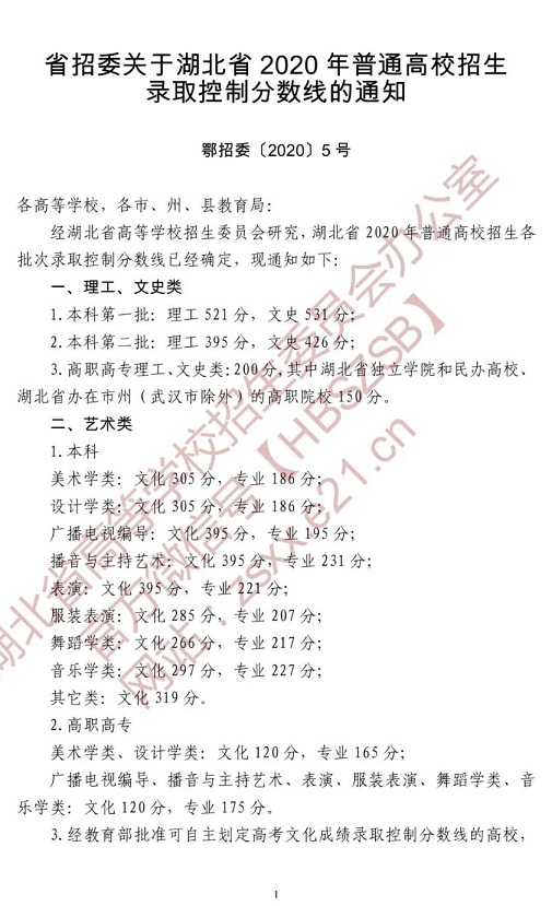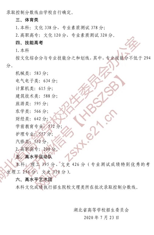 湖北2020年普通高校招生錄取控制分?jǐn)?shù)線