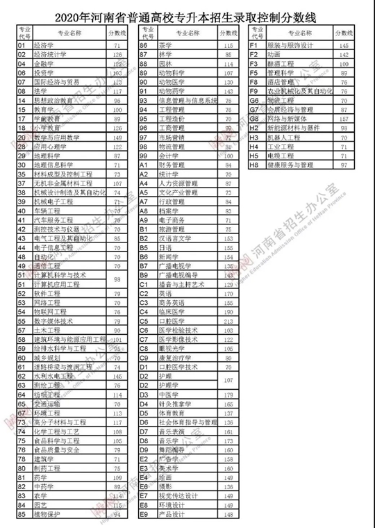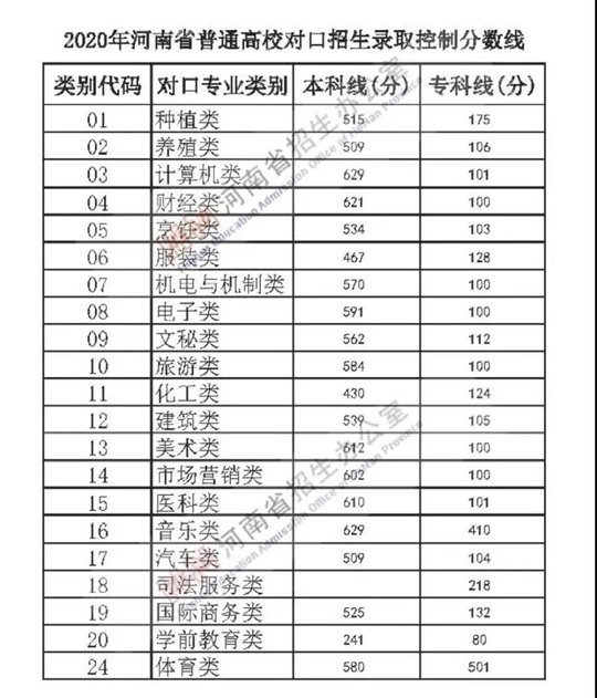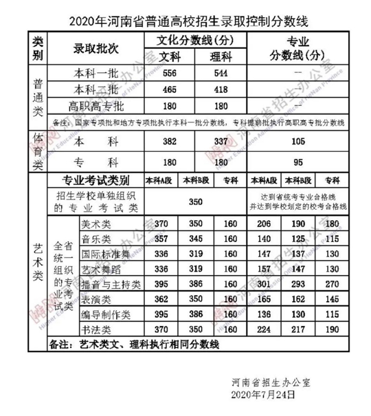 2020年河南省普通高校招生錄取控制分?jǐn)?shù)線