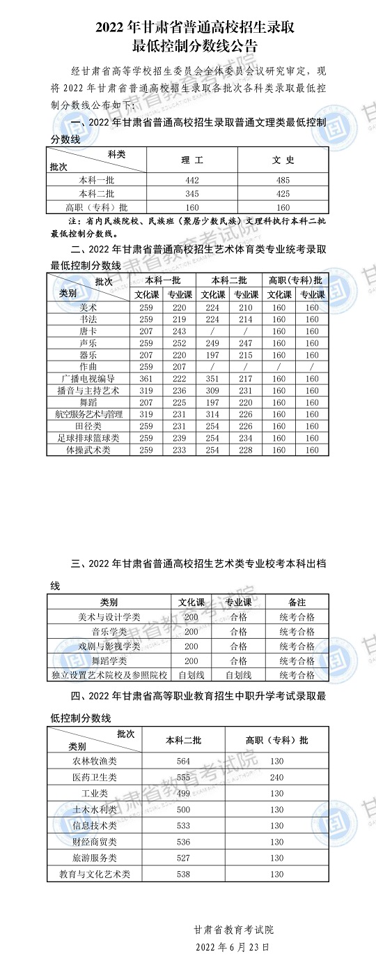 2022年甘肅省普通高校招生錄取最低控制分?jǐn)?shù)線