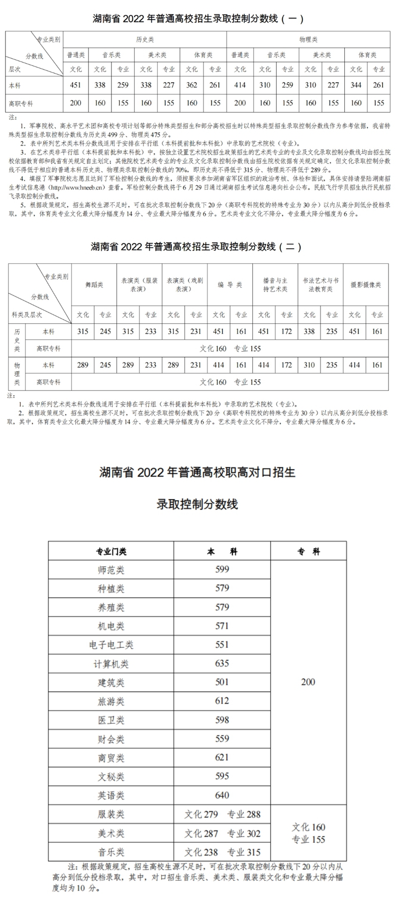湖南省2022普通高校招生錄取控制分?jǐn)?shù)線