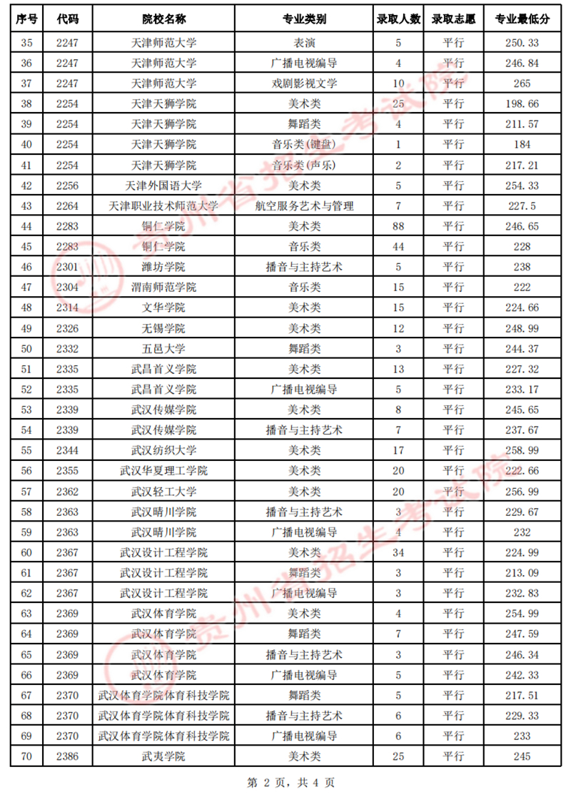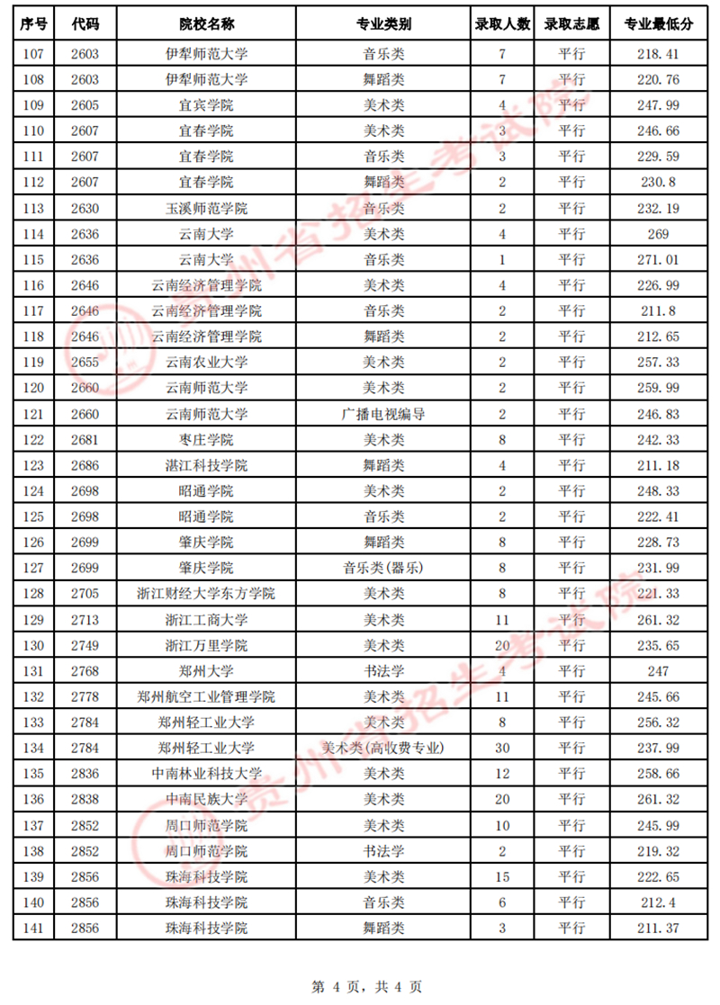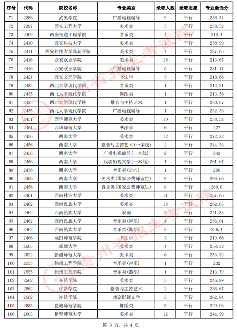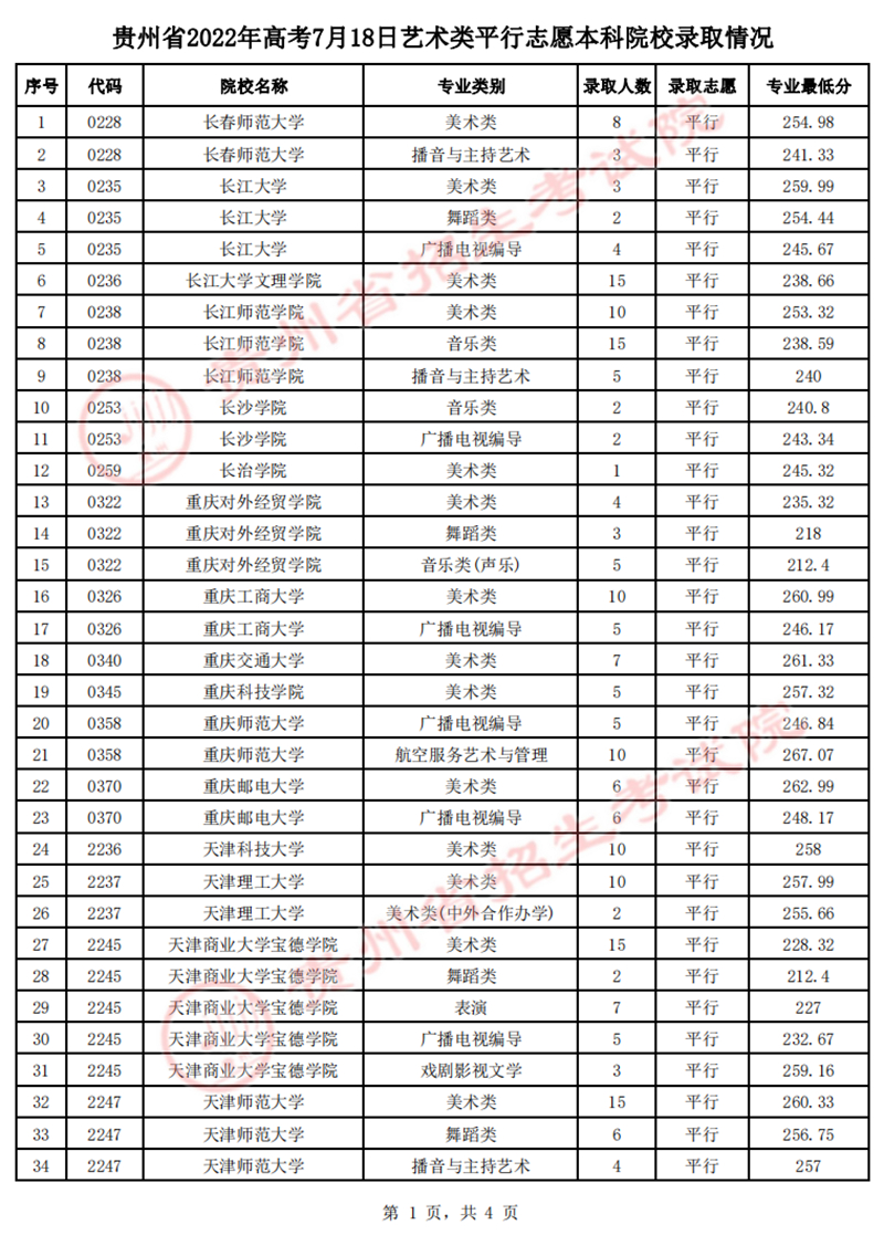 貴州:2022年高考7月18日藝術類平行志愿本科院校錄取情況