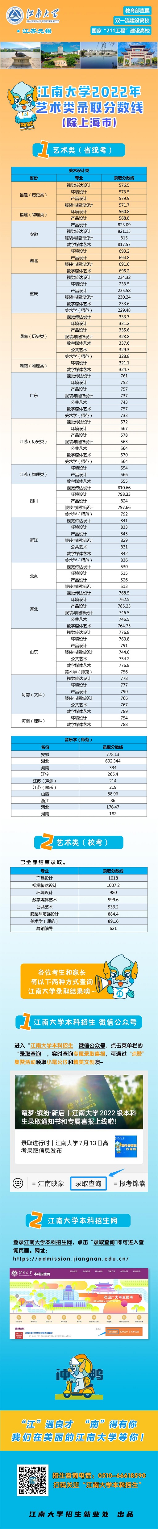 江南大學(xué)2022年藝術(shù)類錄取分?jǐn)?shù)線(除上海市)