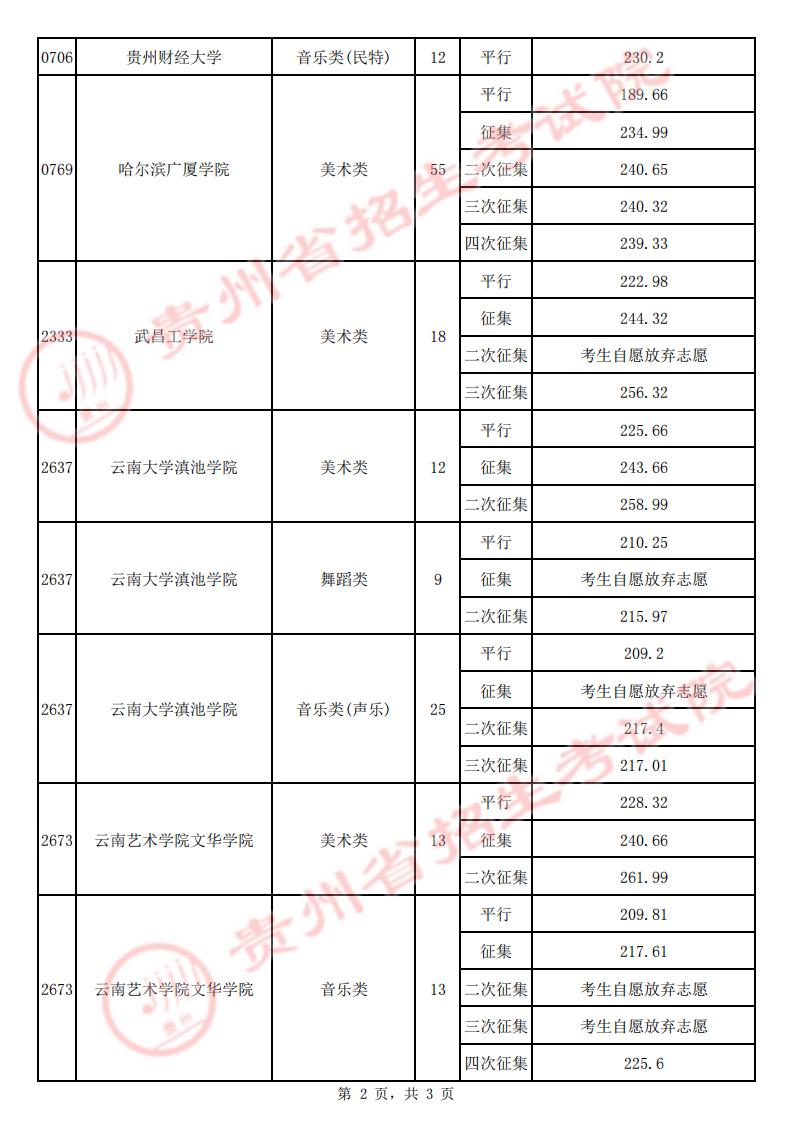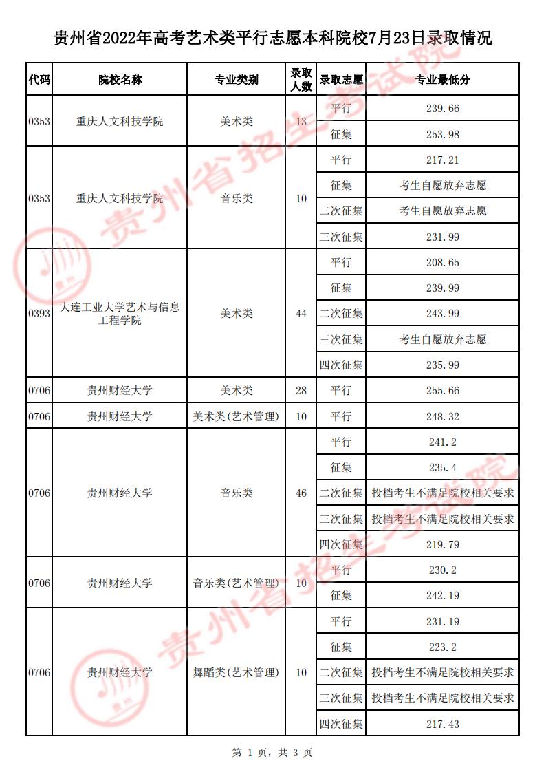 貴州:2022年高考7月23日藝術(shù)類平行志愿本科院校錄取情況