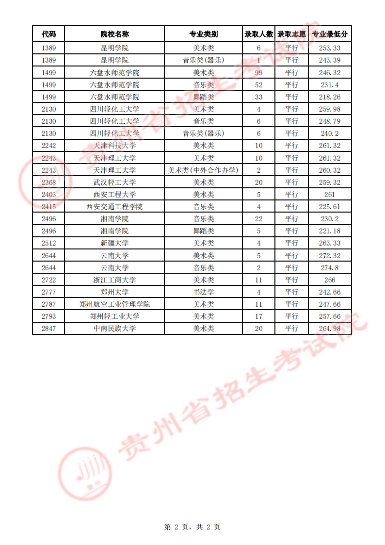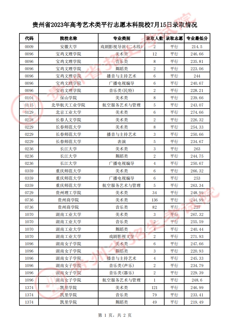 貴州省2023年高考藝術(shù)類平行志愿本科院校7月15日錄取情況