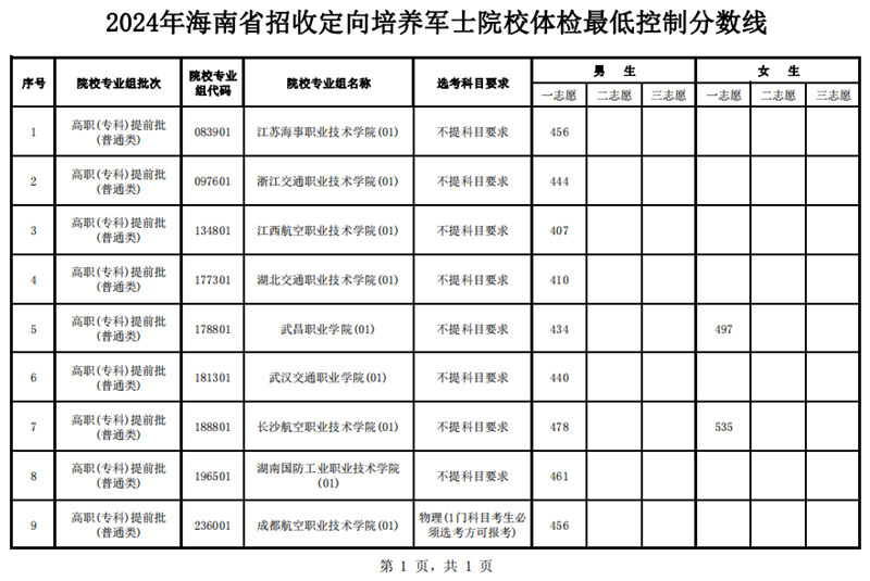2024年海南省招收定向培養(yǎng)軍士院校體檢最低控制分?jǐn)?shù)線