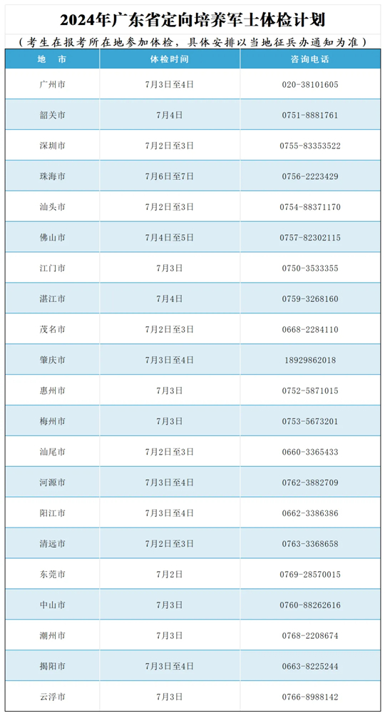 現(xiàn)將2024年廣東省定向培養(yǎng)軍士體檢事項(xiàng)公告如下: