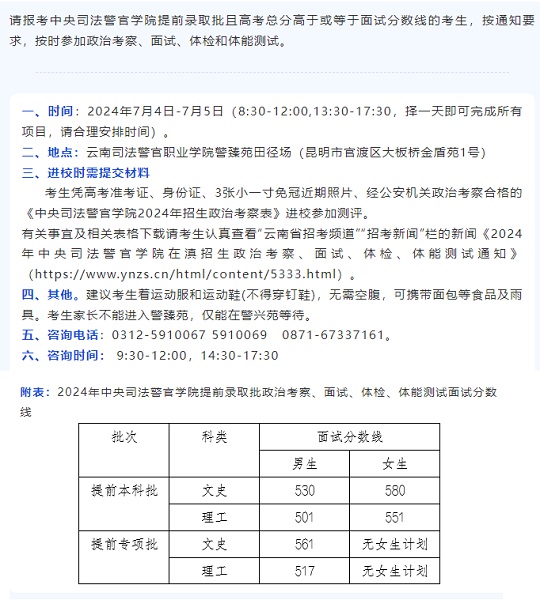 云南:2024年中央司法警官學(xué)院提前錄取批政治考察面試體檢體能測(cè)試相關(guān)要求及面試分?jǐn)?shù)線