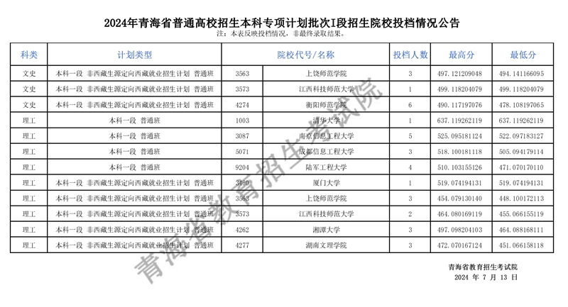 2024年青海省普通高校招生本科專項計劃批次I段招生院校投檔情況公告