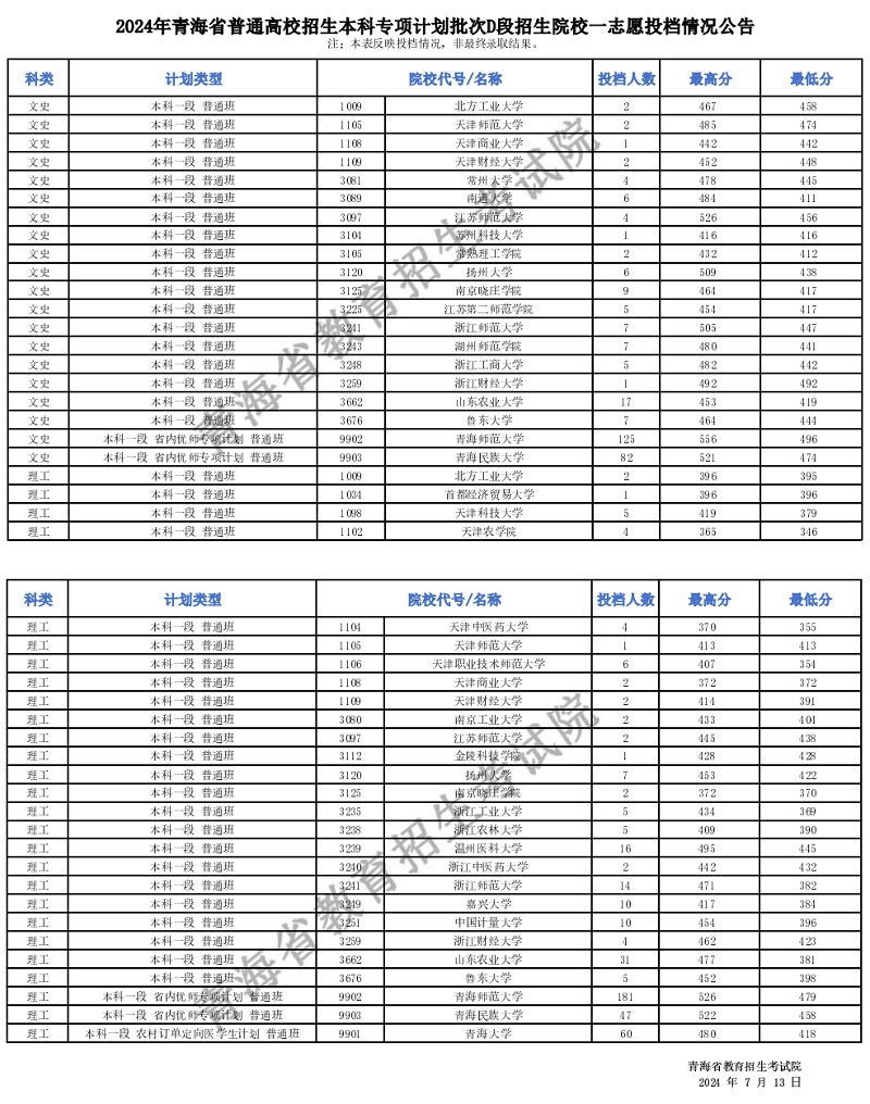 | 2024年青海省普通高校招生本科專項計劃批次D段招生院校一志愿投檔情況公告 |