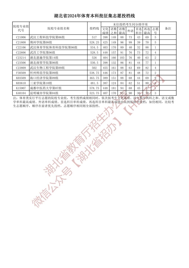 湖北省2024年體育本科批征集志愿投檔線
