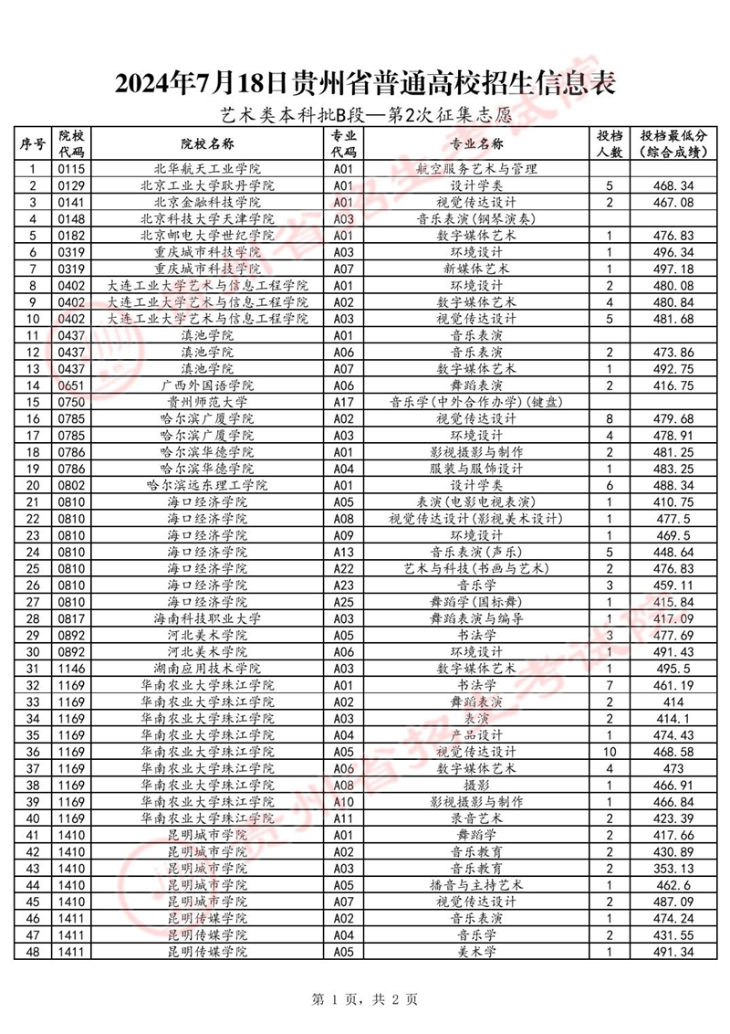 2024年7月18日貴州省普通高校招生信息表(藝術(shù)類本科批B段—第2次征集志愿)