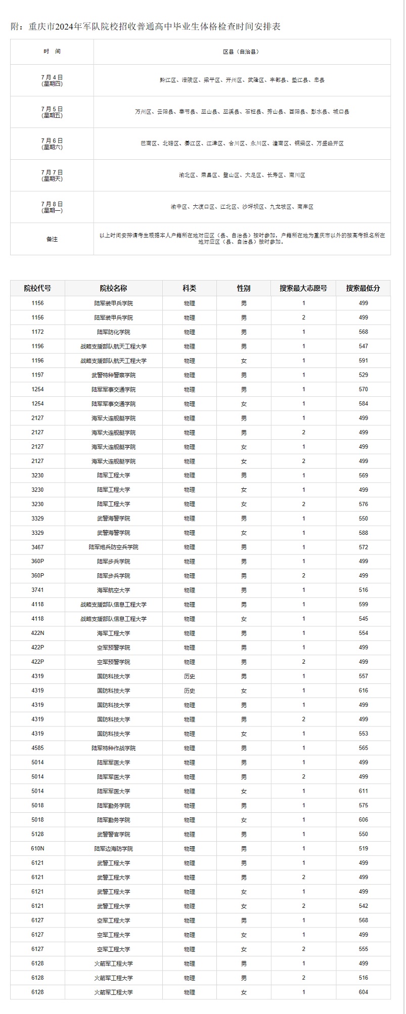 2.考生體格檢查具體時間安排按《重慶市2024年軍隊院校招收青年學(xué)生體格檢查時間安排表》(附后)執(zhí)行。每日7時開始組織體格檢查,凡在規(guī)定時間內(nèi)未參加體格檢查的考生,填報的軍隊院校志愿作自動放棄處理。