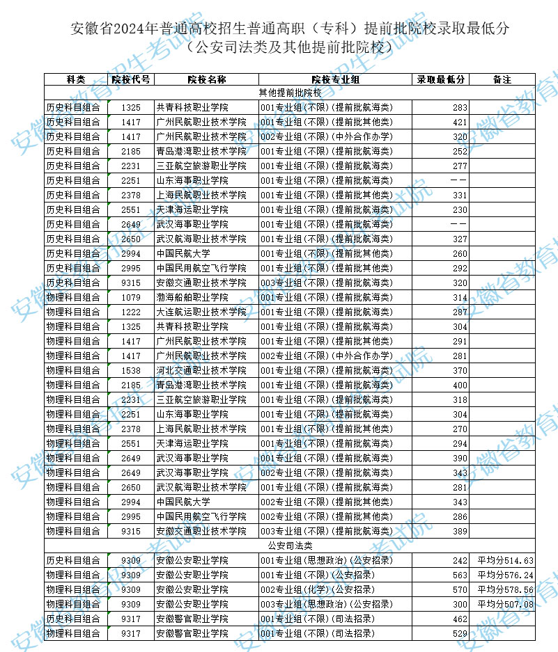 安徽:2024年普通高職(?疲┨崆芭瞧叫兄驹竿稒n院校專業(yè)組錄取最低分