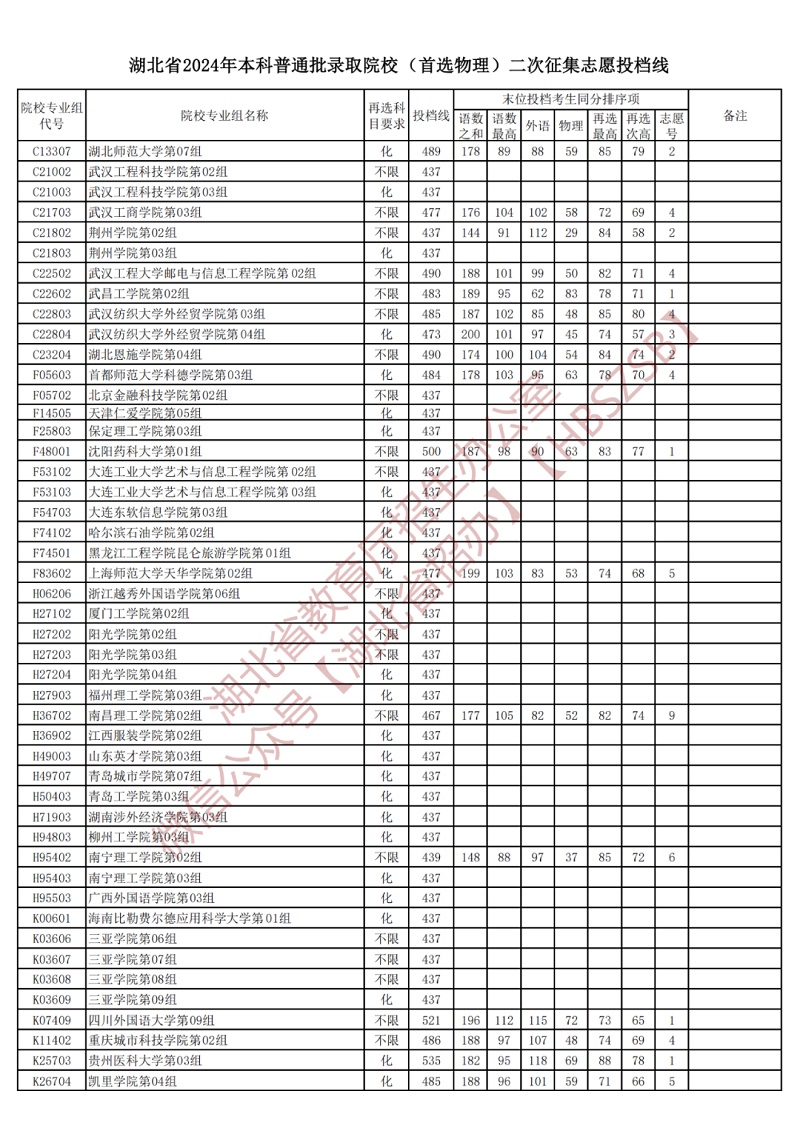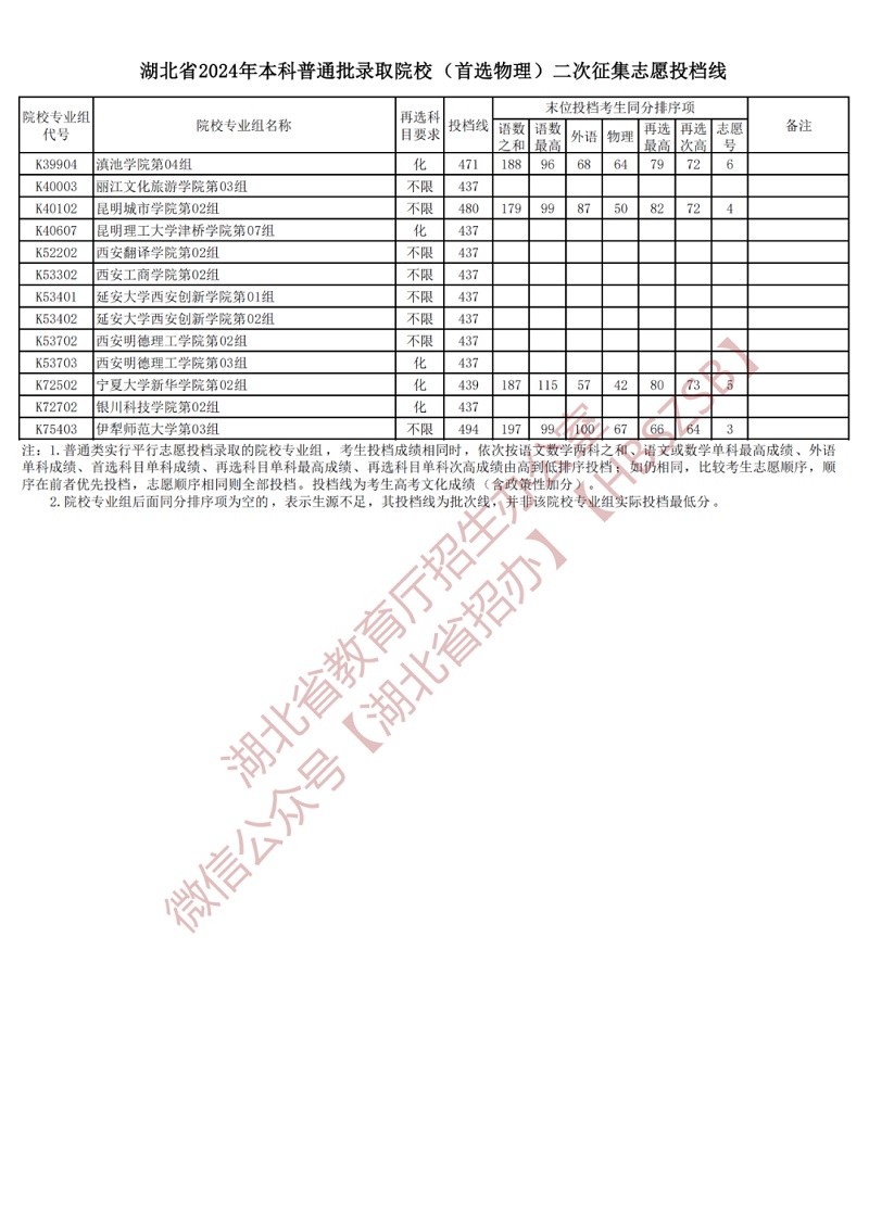 湖北省2024年本科普通批錄取院校(首選物理)二次征集志愿投檔線
