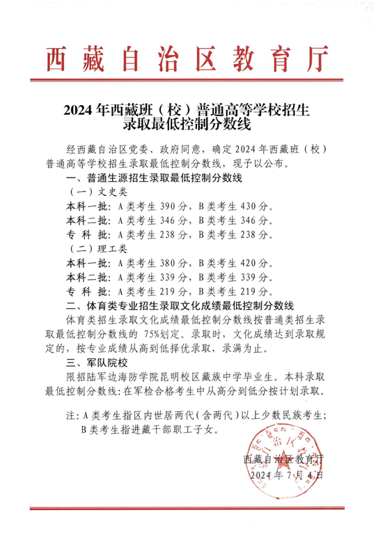 2024年西藏班(校)普通高等學(xué)校招生錄取最低控制分?jǐn)?shù)線