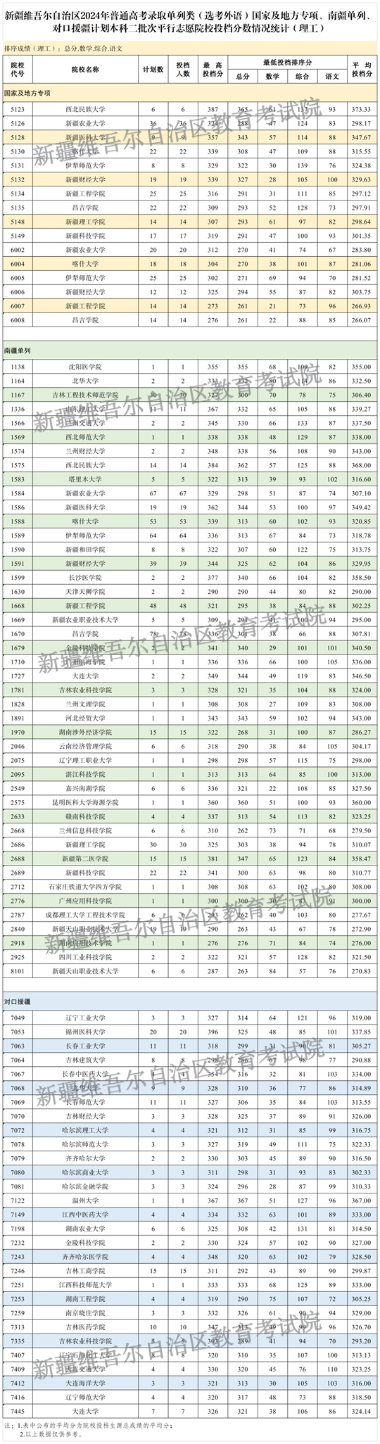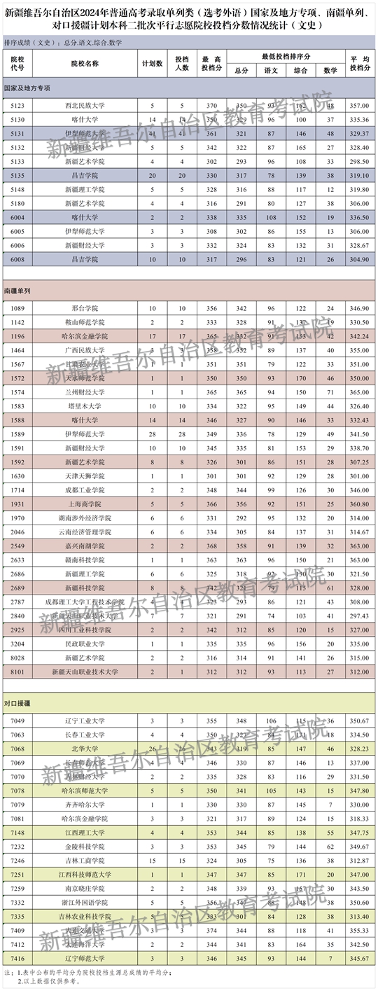 | 新疆維吾爾自治區(qū)2024年普通高校招生單列類(選考外語)國家及地方專項、南疆單列、對口援疆計劃本科二批次投檔情況 |