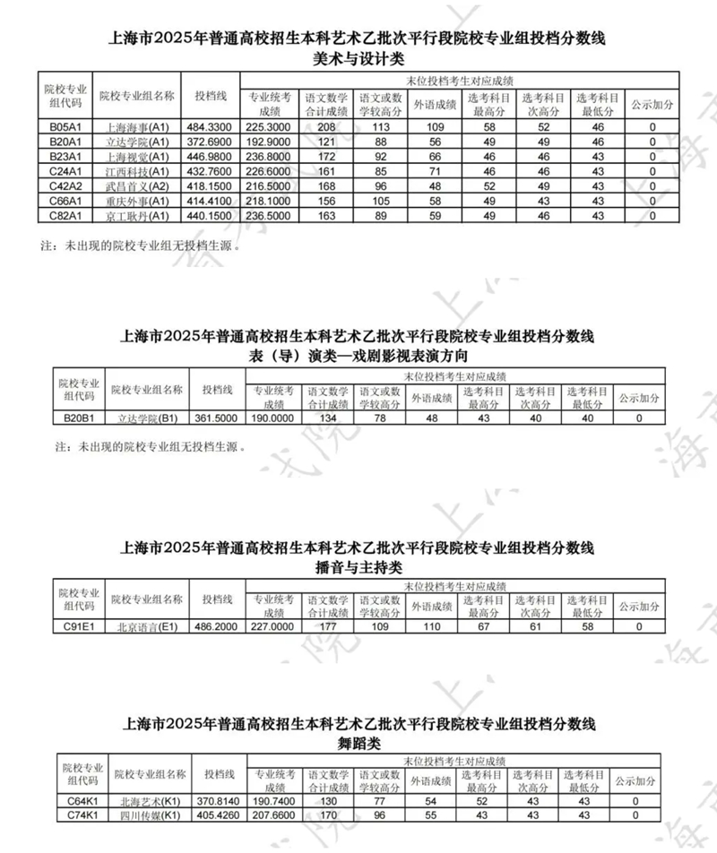 | 上海市2025年普通高校招生本科藝體類乙批次平行段院校專業(yè)組投檔分?jǐn)?shù)線 |