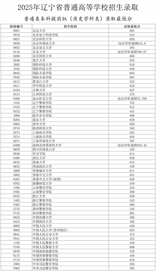 2025年遼寧省普通高等學(xué)校招生錄取普通類本科提前批(歷史學(xué)科類)錄取最低分(點擊查看)