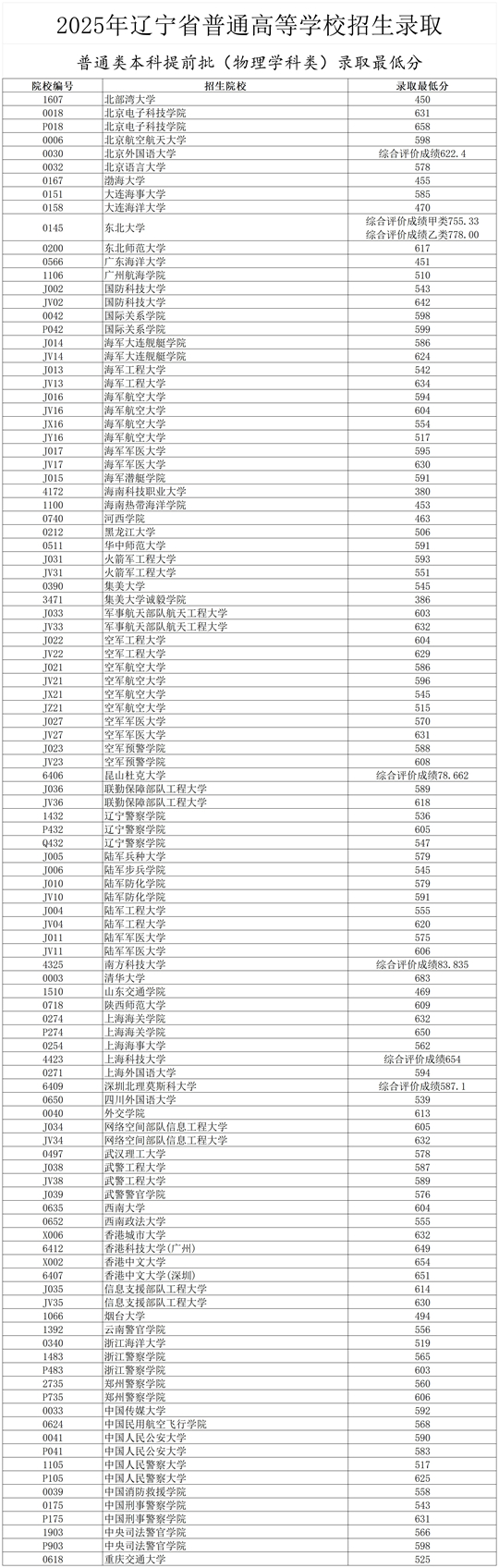 2025年遼寧省普通高等學(xué)校招生錄取普通類本科提前批(物理學(xué)科類)錄取最低分(點擊查看)