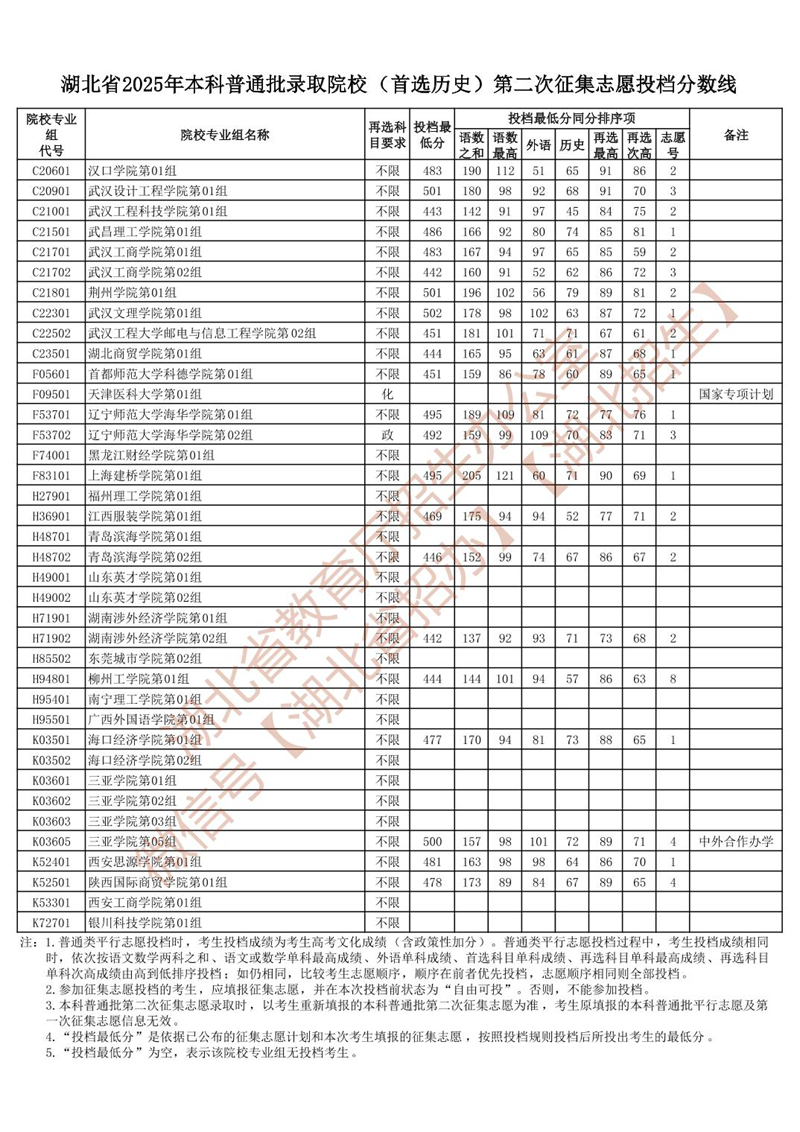 | 湖北省2025年本科普通批錄取院校 (首選歷史)第二次征集志愿投檔分數(shù)線 |