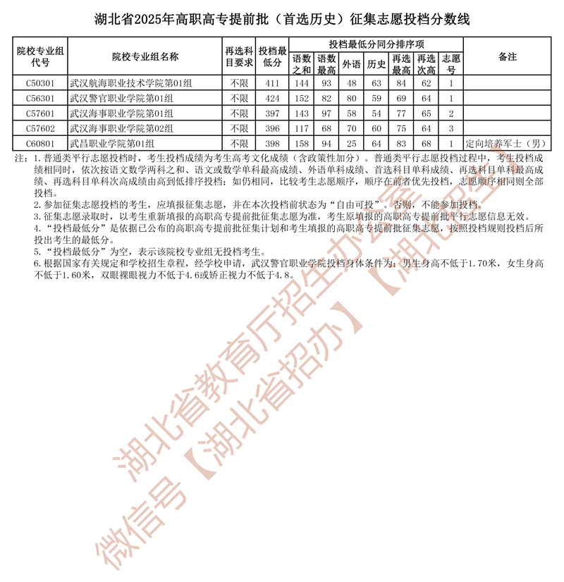 湖北省2025年高職高專提前批(首選歷史)征集志愿投檔分?jǐn)?shù)線