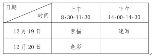 美術(shù)與設(shè)計類專業(yè)省統(tǒng)考安排在2020年12月19日-20日進(jìn)行,各科目考試時間具體安排如下: