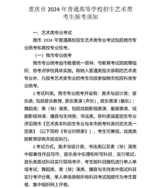 重慶市2024年普通高等學校招生藝術類考生報考須知