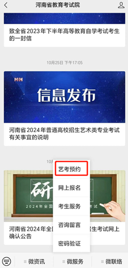 點擊“河南省教育考試院”微信公眾號菜單,選擇【微服務(wù)】->【藝考預(yù)約】,進入藝考預(yù)約的小程序,進行預(yù)約操作。