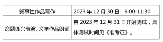 敘事性作品寫作科目:考生持本人《準(zhǔn)考證》《不攜帶手機(jī)進(jìn)入考點(diǎn)承諾書》、身份證原件等材料,按規(guī)定時(shí)間和地點(diǎn)參加考試。開考前45分鐘考生開始入場,開考15分鐘后遲到考生不得進(jìn)入考點(diǎn)參加當(dāng)次科目考試。考試結(jié)束后方可交卷出場。