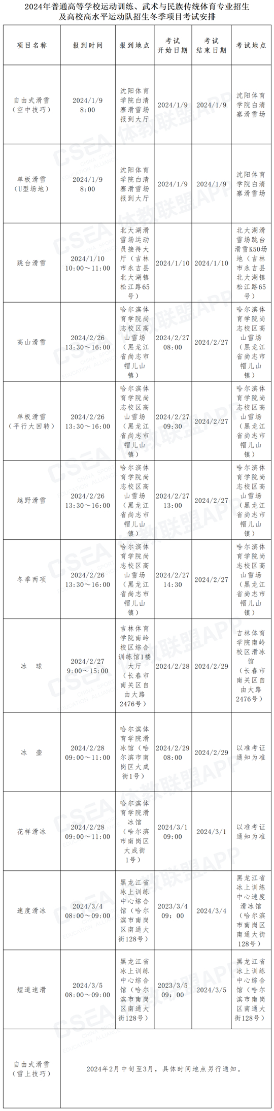 2024年普通高等學(xué)校運(yùn)動(dòng)訓(xùn)練、武術(shù)與民族傳統(tǒng)體育專(zhuān)業(yè)招生及高校高水平運(yùn)動(dòng)隊(duì)招生冬季項(xiàng)目考試安排 點(diǎn)擊查看