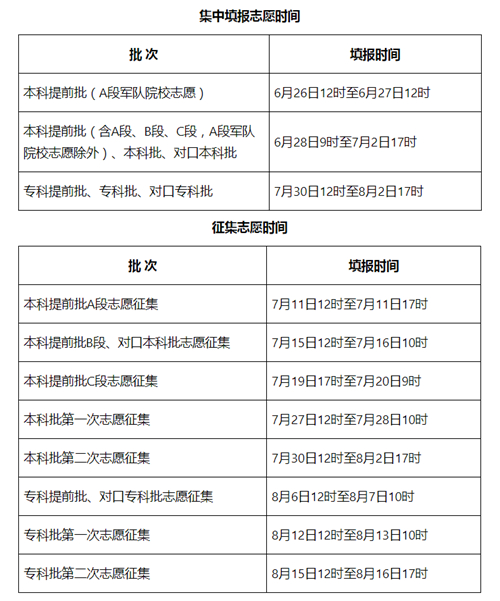 軍隊(duì)(含武警,下同)院校招生計劃安排在本科提前批A段,實(shí)行順序志愿投檔,設(shè)1次集中填報志愿和1次征集志愿,考生每次可填報1所學(xué)校,每所學(xué)校設(shè)6個專業(yè)志愿和1個專業(yè)服從調(diào)劑選項(xiàng)。集中填報志愿時間為6月26日12時至6月27日12時。