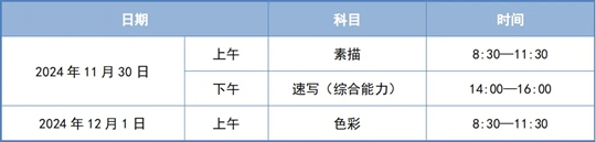 美術(shù)與設(shè)計(jì)類考試科目為速寫(綜合能力)、素描和色彩,每科100分,總分300分?荚嚂r(shí)間如下: