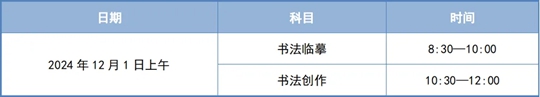 書法類考試科目為書法臨摹、書法創(chuàng)作兩個(gè)科目,每科150分,考試時(shí)間如下: