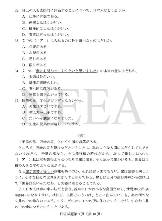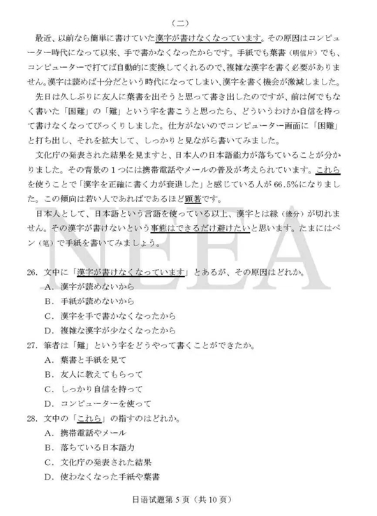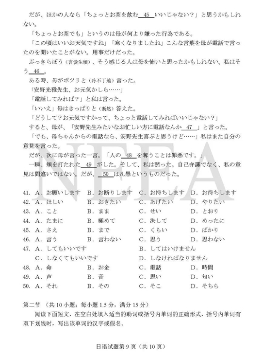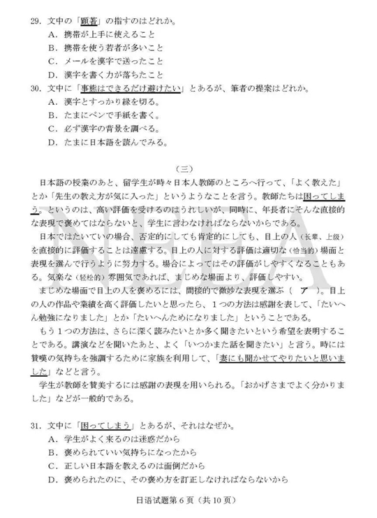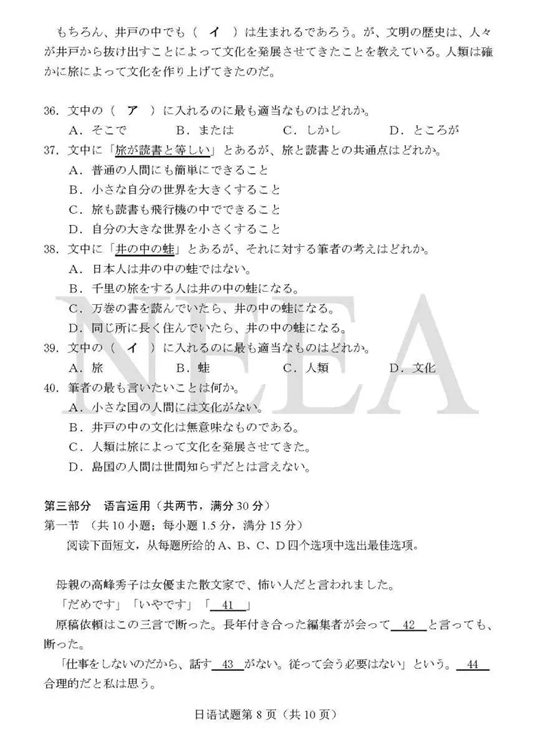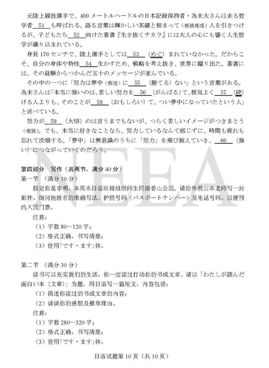 第三部分為語言運(yùn)用,從原來的40道單句題變?yōu)?個(gè)篇章,每個(gè)篇章后面設(shè)10道小題,是在篇章和具體情境中考查日語理解和運(yùn)用能力的延續(xù)。2個(gè)篇章中,1篇的題目形式為四選一,另1篇?jiǎng)t為填空題,考查的內(nèi)容包括詞的活用、詞的選擇、漢字書寫、漢字讀法等諸多方面,為日語基礎(chǔ)扎實(shí)、活學(xué)活用能力強(qiáng)的考生提供了更多的得分空間。