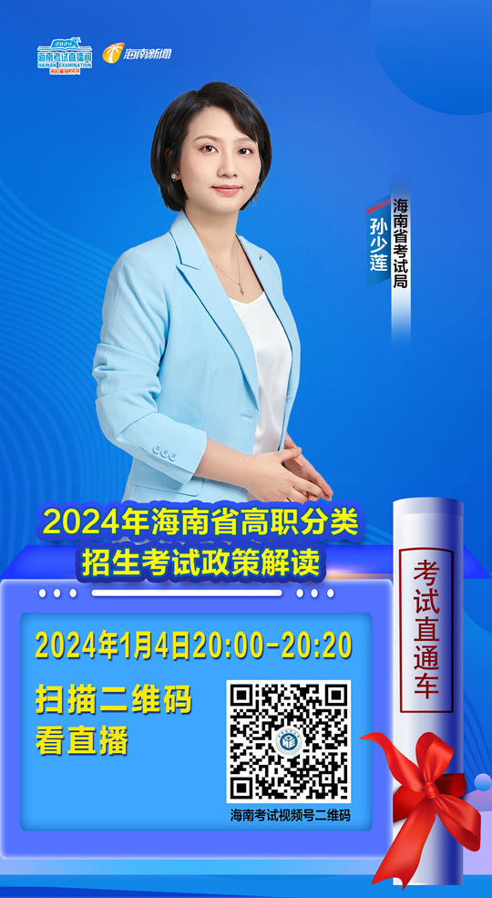 | 海南考試直播間1月4日20:00開(kāi)播2024年海南省高職分類招生考試政策解讀 |