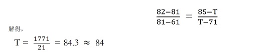 假設(shè)某同學(xué)思想政治學(xué)科原始分為81分,而該學(xué)科B等級(jí)的原始分分布區(qū)間為82——61,則該同學(xué)思想政治學(xué)科的原始分屬B等級(jí),B等級(jí)的等級(jí)分分布區(qū)間為85——71,按照轉(zhuǎn)換公式該同學(xué)思想政治學(xué)科的等級(jí)分為: