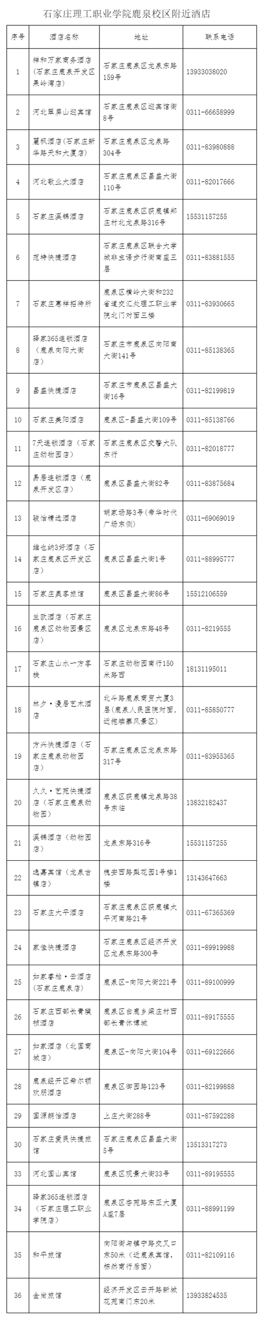 石家莊理工職業(yè)學(xué)院鹿泉校區(qū)附近賓館如下(僅供考生參考,住宿地點(diǎn)請(qǐng)避開(kāi)馬拉松賽區(qū)):