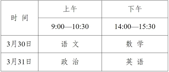 體育單招文化考試科目為語文、數學、政治、英語四科,每科滿分為150分,四科滿分為600分,使用國家通用語言文字作答?荚嚂r間為: