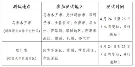 三、測(cè)試時(shí)間:4月24日至26日(如因天氣原因臨時(shí)有變動(dòng),另行通知,請(qǐng)隨時(shí)關(guān)注新疆教育考試院官方網(wǎng)站www.xjzk.gov.cn)。