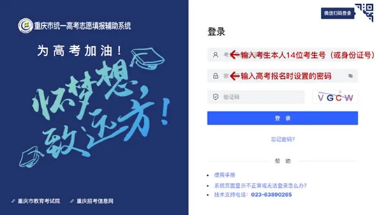 即日起,考生可以通過“重慶市教育考試院門戶網(wǎng)(www.cqksy.cn)”或“重慶招考信息網(wǎng)(www.cqzk.com.cn)”進(jìn)入“重慶市統(tǒng)一高考志愿填報(bào)輔助系統(tǒng)”的登錄頁面。根據(jù)提示,依次輸入考生本人14位考生號(hào)或身份證號(hào)、高考報(bào)名時(shí)設(shè)置的密碼和圖形驗(yàn)證碼,點(diǎn)擊“登錄”,仔細(xì)閱讀并確認(rèn)特別聲明后即可進(jìn)入系統(tǒng)(微信小程序功能即將上線,敬請期待)。